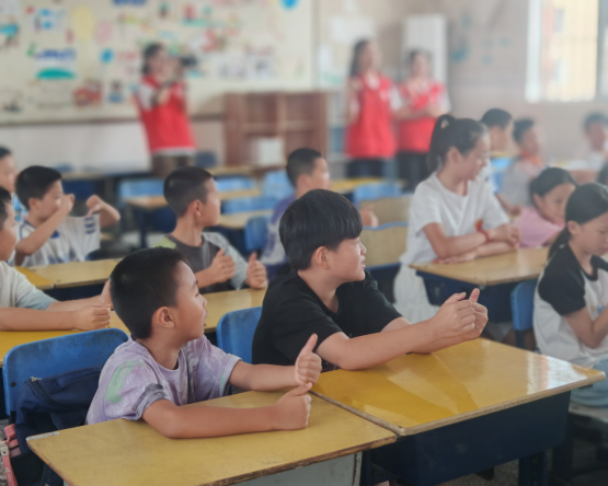 开营仪式后,孩子们在班主任以及助教老师的带领下前往班级,井然有序地开展破冰活动。在“最强大脑”游戏环节中,孩子们纷纷举手抢答,有的孩子急得站起来大声说出答案,在得到班主任的肯定之后露出得意的笑容;“你最棒”互动环节里,孩子们互相竖起大拇指喊出“你真棒”,现场氛围热烈又欢快,原先腼腆的孩子也因为得到同学的肯定而露出发自内心的笑容;“相反运动”游戏中,听到“举左手”却有人举起右手,引来一阵欢笑,错误的小朋友立刻纠正动作,现场气氛在一片欢声笑语中愈发活跃。志愿老师们穿梭在孩子们中间,全程关注每位学生状态。游戏结束后,班主任重点介绍了班规和积分表现制度,希望这段充实的时光里,孩子们能学有所获、快乐成长。
