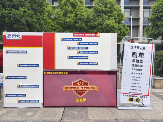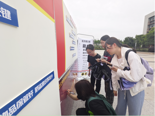 4月23日,校园广场展示活动现场精心规划为知识展板区、互动游戏区和文艺展示区三大区域,吸引了众多师生踊跃参与。在知识展板区,主题鲜明、内容详实的国家安全知识展板有序陈列,专业引导员穿梭其中,并向师生发放国家安全知识手册,助力知识传播。互动游戏区则充满欢声笑语,安全知识问答大转盘、破译密码、抢答赛等趣味游戏轮番上阵,工作人员巧妙地将国家安全知识融入游戏环节,让参与者在轻松愉悦的氛围中学习知识、强化意识。文艺展示区展出了“国安如泰山,全民共守护,点滴行动筑安全防线”主题书画作品征集活动的优秀作品,同学们用笔墨丹青、创意构思,生动诠释了国家安全的深刻内涵,吸引众多师生驻足欣赏。此外,现场还设置“我为国家安全代言”签名墙,师生们纷纷在墙上郑重签下姓名,定格下守护国家安全的庄严承诺。