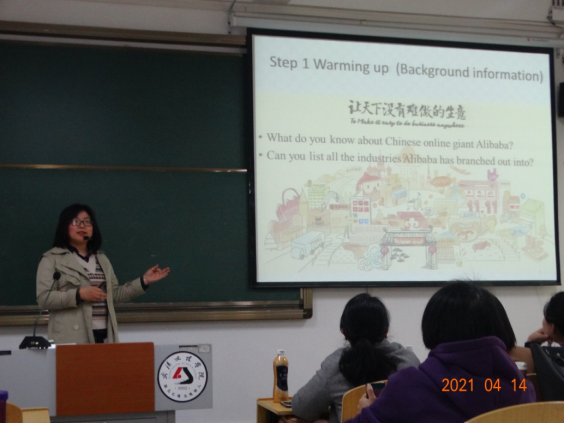 其中商务英语系的3位教师们给我们带来了一场受益颇多的教学洗礼。商务英语系刘俊老师以师生熟悉的阿里巴巴公司为切入点,深入浅出地讲解商务英语知识、分析阅读技巧的运用,帮助学生们理解晦涩难懂的商务英语文本,掌握商务知识和词汇。