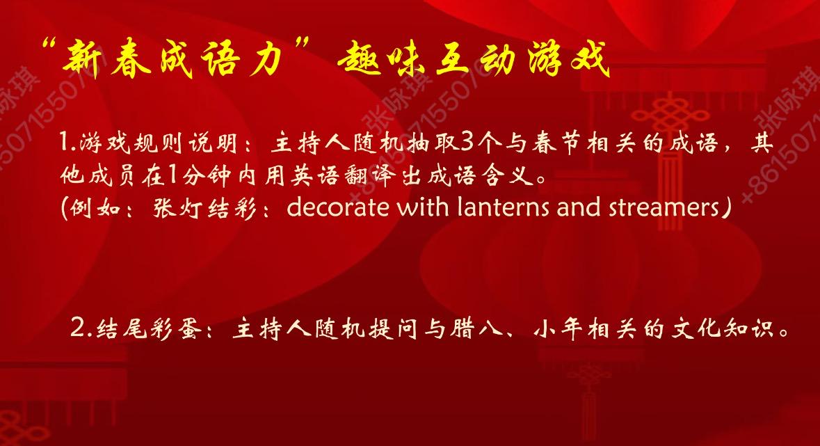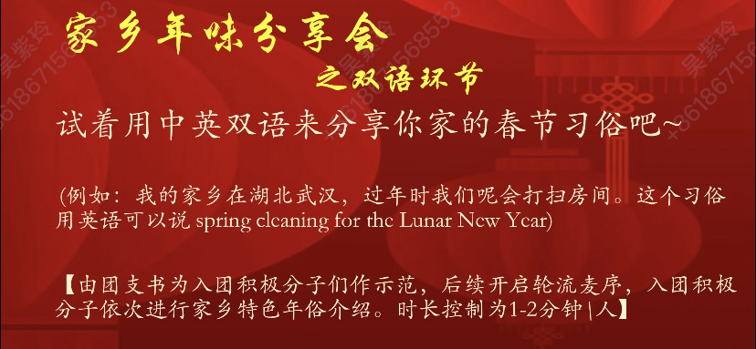 其中,“家乡年味”双语分享环节亮点纷呈,同学们结合专业所长,以中英双语介绍家乡春节习俗,从贵州打糍粑到湖北杀年猪,从潮汕功夫茶到武汉武昌鱼,在展现地域年俗魅力的同时,锻炼了双语应用能力,促进了地域文化交流互鉴;春节成语中英互译、年俗知识问答等趣味互动,则点燃活动氛围,既检验了同学们的文化积累与专业素养,也让大家在轻松氛围中深化了对年俗文化的理解。活动最后,学院倡议同学们可以利用寒假走访调研身边年俗,以实践传承中华优秀传统文化。