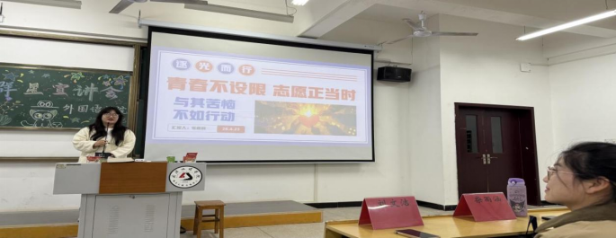 杨建国学长虽然没有到场,但他用精心制作的小短片为我们讲解了何为“西部计划”。学长以“到西部去、到基层去、到祖国最需要的地方去”为主题,分享西部计划的初心、经历与成长。他介绍,西部计划是由团中央、教育部等四部门联合实施的国家项目,招募应届毕业生或在读研究生,到西部基层开展为期1—3年的志愿服务,涵盖乡村教育、服务三农、基层青年工作等多个专项。他结合自身服务经历,讲述在西部基层的工作日常:参与乡村教学、协助基层治理、助力乡村振兴,在艰苦环境中锤炼意志、增长才干。杨学长讲到,西部计划不仅是一次志愿服务,更是一次深刻的人生历练,能让人深入了解国情、厚植家国情怀。同时,他详细解读西部计划的政策支持:服务期间享受生活补贴与保险,计算工龄;服务期满考核合格,考研可加分、考公考编有优惠,落户与就业也有相应支持。他鼓励有理想、敢担当的同学们,抓住青春机遇,响应国家号召,用几年青春做一件终身难忘的事,让青春之花绽放在祖国最需要的地方。