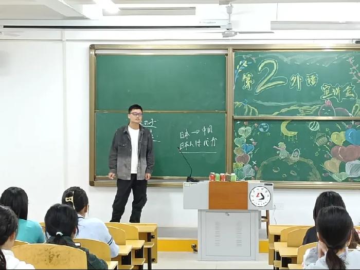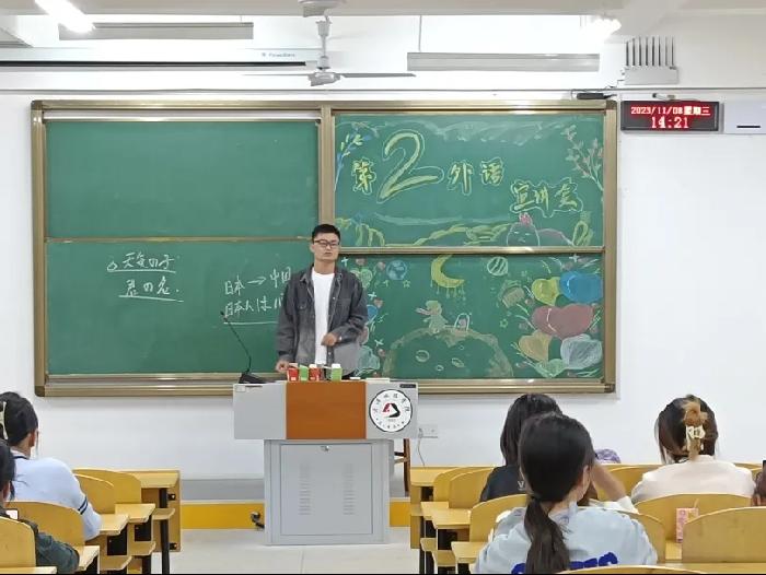 接下来,陶建明老师以标准化日语进行开场白,并用幽默风趣的语言介绍了日语在日常生活中使用场景,以及日语传播的二次元文化。在结束宣讲时,陶老师强调:兴趣是最重要的,切勿盲目跟风。