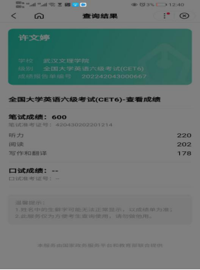 在2020年12月12日举行的全国大学英语四六级考试中,我校学生取得了突破性好成绩!自查分以来,不断有好消息传出,其中19级医学影像技术专业的许文婷同学,成绩优异,在本次六级考试中取得了600分的高分。