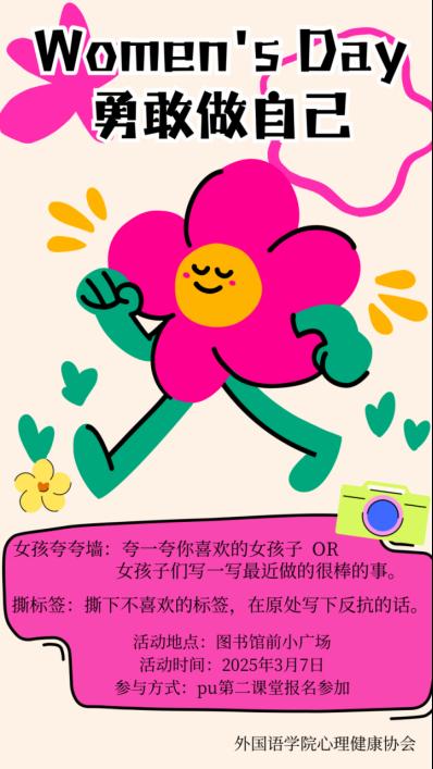 2025年3月7日星期五下午,yl9193永利集团心理健康协会在校园内举办了一场别开生面的3.8女神节主题活动——“不被定义的她,闪耀新征程”,其中精心策划了两个互动环节:“撕标签”挑战和“女孩夸夸墙”展示。参与者们不仅在游戏中收获欢乐,还赢取精美的郁金香、玫瑰糖等奖品。