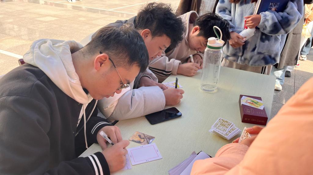 活动现场,三大游戏——“OH卡牌-探索心灵”、“心灵妙绘,印出心声”与“树叶写字”,同学们热情高涨,不畏严寒,排起长龙般的队伍,积极参与其中。他们的欢声笑语,如同冬日里的一缕暖阳,温暖了整个校园,为寒冷的冬日增添了一抹温馨的色彩。