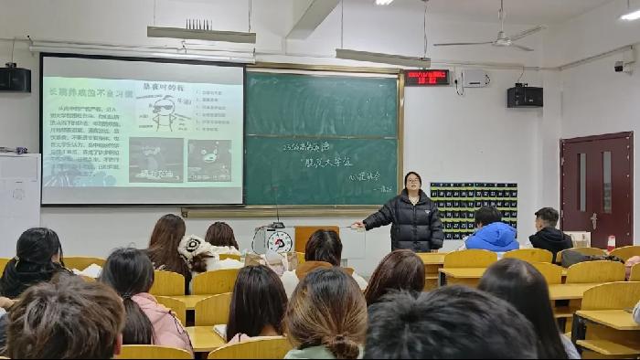 在班会中,各班心理委员精心准备。22级就当代大学生的脆皮现象,列举大学生群体中频发的“脆皮”事例,告诉同学们定期休息和放松是维持心理健康的关键,与人沟通是促进心理健康的重要途径。除此以外,23级心委们还在班会中插入各类游戏互动环节,如外语班开展了“心理知识问答”的小活动,通过互动的形式进行心理知识分享,交流思想动态,并改变提问的常规模式,增加问题的趣味度,吸引同学们积极参与;法语班开展了“举哑铃”的互动环节,从心理健康到身体健康,正向传递大学生身心健康的统一性,同时也增强班级的凝聚力和友谊;商务英语班开展了“手口不一”小游戏,该游戏带来很多精彩的瞬间,其中猜词、快速反应、团队合作还是挑战自我环节,让班级同学感受到了参与的乐趣。