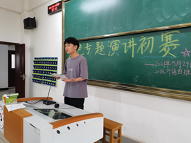 为响应学院号召,外语四班于2021年5月24日晚自习期间举行了红色专题演讲初赛。选拔出了三名参加决赛的同学,他们是:黄宇,覃玉环,曹世奇。其他参赛的同学有:王嘉欣,向美林,陈康,张梦。