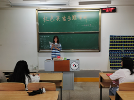 本该次活动以红色专题为主题,有十名选手参与了本次活动,分别是:黎诗丹,王秀慧,梁钰鹏,张萌,昝星雨,赵季茹,胡欣然,吴倩,吴玉芳,熊远,经过激烈的角逐,最终三名同学晋级决赛,分别是:张萌,吴倩,黎诗丹,经过这次活动,增加了同学们对中国红色文化的深刻认识,还对对党和国家有了更深刻的认识。