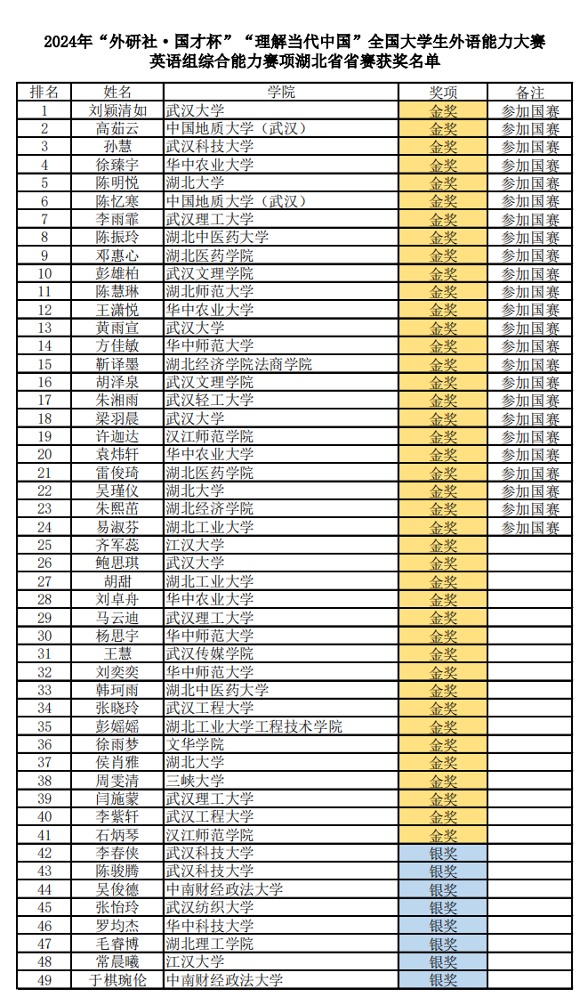 10月26日,2024年“外研社 · 国才杯”“理解当代中国”全国大学生外语能力大赛英语组综合能力赛项湖北省省赛在中国地质大学(武汉)落下帷幕。本次大赛共有来自武汉大学、华中师范大学、中国地质大学、武汉学院等全省各所高校共425名选手同台竞技,yl9193永利集团有6名选手通过校赛的激烈竞争,入围省决赛。经过激烈角逐,我校的优秀选手彭雄柏和胡泽泉荣获金奖,成功晋级国赛,柯敏和滕慧婵荣获铜奖,陈月和曹昉获得优胜奖。这六位同学取得的奖项名次创我校历史最佳成绩!