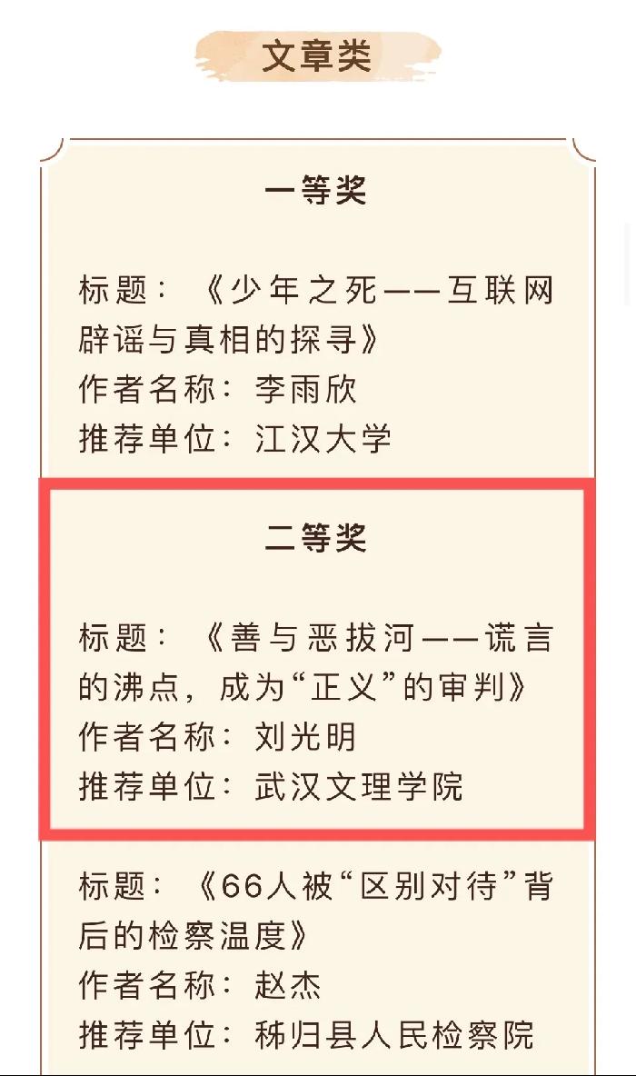 近日,我院学子在湖北省首届互联网辟谣优秀作品征集评选活动中斩获佳绩。由21级翻译班刘光明同学创作的《善与恶拔河——谎言的沸点,成为“正义”的审判》作品,荣获文章类二等奖。