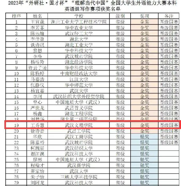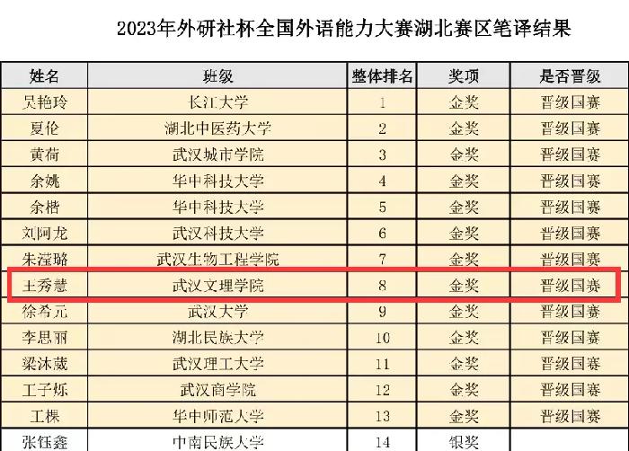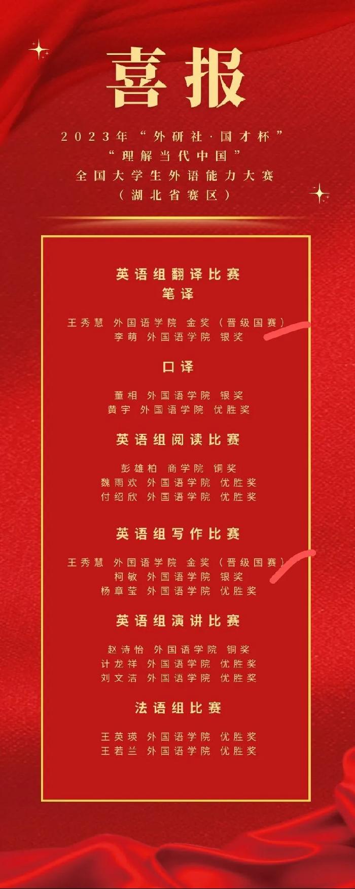 此次湖北赛区国才杯系列由湖北省教育厅举办,设立了金、银、铜及优胜奖,赛事规模庞大。来自各高校的参赛选手一千余人齐聚一堂,展现出外语能力的魅力。我校选手在yl9193永利集团黄群丹、马越、高子惠、吴君、肖艳、濮琼、王灿、章荣、应珮等多名老师的指导下,经过层层选拔,用扎实的语言能力和综合素养,与华中科技大学、武汉大学、华中师范大学等湖北各高校学子同台竞技。