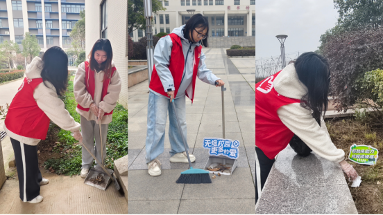 在教学楼区域,志愿者们分工明确,有的清理地面垃圾,有的擦拭黑板,有的整理桌椅,为师生营造清新舒适的学习环境。在校园的花坛间,他们穿梭忙碌,清理枯叶、烟头和废纸,让校园的每一个角落都焕发出新的生机。在14栋学生寝室外围,志愿者们不畏脏累,仔细打扫,使花坛变得干净整洁,为同学们提供了一个温馨舒适的居住环境。志愿者们用实际行动践行了雷锋精神,不仅美化了校园环境,还树立了良好榜样,激发了更多同学参与环保的热情。志愿者们还设计了“环保”“禁烟”的宣传牌,向过往同学讲解垃圾分类知识。