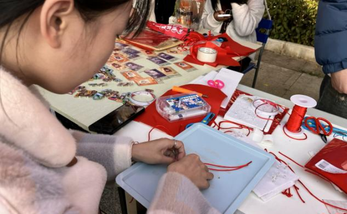 此外,“红色编织”项目,两三人为一组围坐一起,相互帮助、共同探讨,用一根根红色的线编织出一个个精美的中国结、平安结等,这些结寓意着团结、和谐与美好。