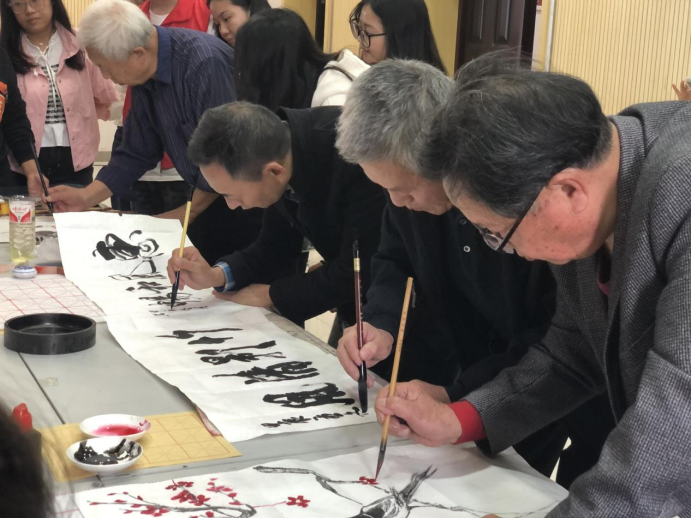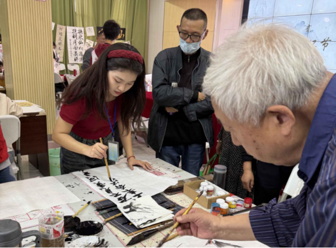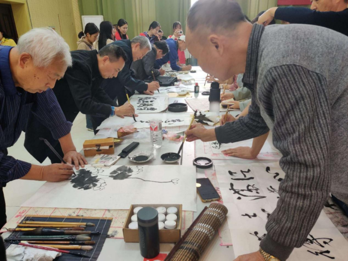 活动现场,老年艺术家与同学们共同参与了书画作品的创作与鉴赏。首先,大家通过欣赏和学习,领略了书画艺术的魅力与精髓。随后,同学们纷纷挥毫泼墨,展示书法与绘画技艺。有的同学笔法遒劲有力,仿佛重现了古代书法大师的风采;有的同学则精心磨墨,映照出古代文人墨客练字时潜心钻研的场景;更有同学选择了富有意境的水墨画,用墨水勾勒出一幅幅层峦叠嶂、清晰分明的山川丘壑。