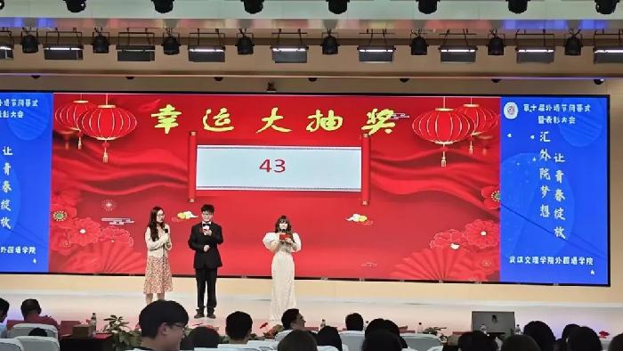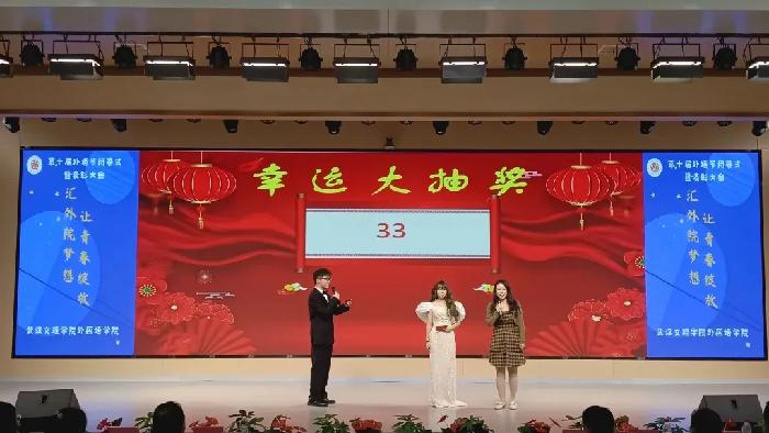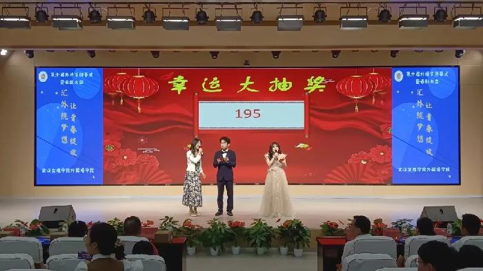在观众入场时,工作人员为前来观看外语节节目的老师和同学们发放入场券,每张入场券上面都标有不同的数字。晚会期间,主持人邀请老师上台抽取幸运数字,中奖的老师或同学们可凭入场券在活动结束后领取精美小礼品。