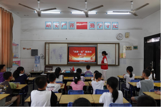 “两弹一星”精神宣讲课接续传递精神力量,让孩子们看到长征精神在科技领域的时代延续。志愿者巧妙衔接起两段历史,随后播放的影像中,火箭腾空的壮丽与戈壁科研人员顶风冒雪的场景交相辉映。