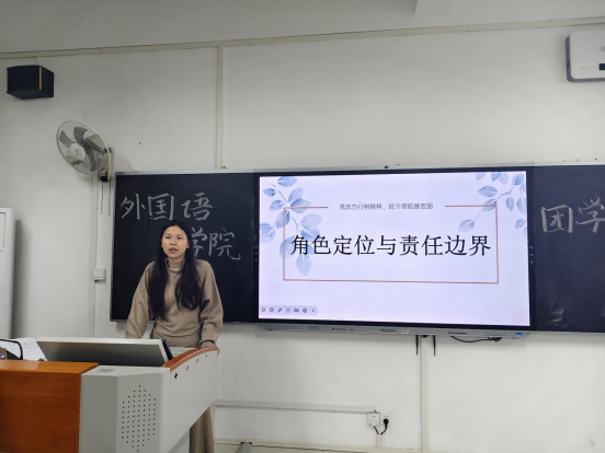 培训课程紧扣学生工作实际痛点与核心需求,精心设置四大实战模块,层层递进实现能力赋能。11月10日,宣传部主席张咏琪围绕宣传工作核心展开授课,结合学院过往优秀宣传案例,从文案撰写技巧、素材筛选整理,梳理实操难点,为新干事搭建起系统完整的宣传工作知识框架,助力其快速掌握对外展示学院风貌的关键技能。11月11日,学生副书记邬军杰聚焦分团委学生会管理条例、作风建设要求及奖惩实施细则,逐条解读核心条款,着重强调责任担当与作风建设的重要意义,明确奖惩标准与执行流程,引导新干事树立牢固的规则意识,为学生组织高效规范运转筑牢制度根基。